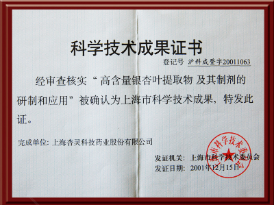 银杏酮酯及其银杏制剂(杏灵颗粒、斯泰隆片)认定为上海促进高新技术成果转换项目