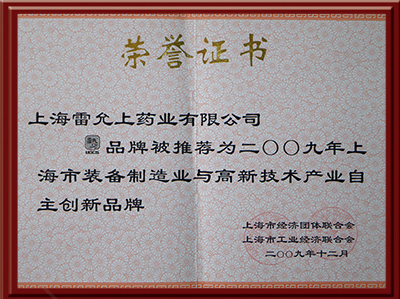 雷氏品牌被推荐为二〇〇九年上海市装备制造业与高新技术产业自主创新品牌
